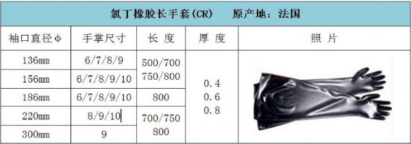 1)手套采用氯丁橡膠制成;2)良好耐化學(xué)性(多價(jià)染色體結(jié)構(gòu));3)良好機(jī)械性保護(hù);4)良好的抗臭氧和抗紫外線性能;5)良好的柔韌性和靈活性。
